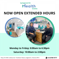 Great news! Langwarrin Health Clinic is now open extended hours on weekdays, from 8am to 6:30pm and on Saturdays from 10am - 2pm!